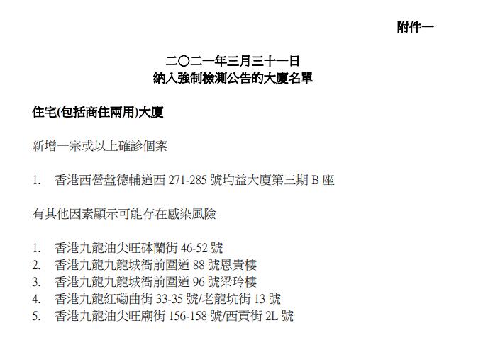 今日(31日)有6個符合上述準則的指明地方將被納入強制檢測公告。當中,由於一名確診人士曾於五幢大廈工作,該些大廈的住客、訪客及工作人員可能會有較高的感染風險,因此有關人士須進行強制檢測。