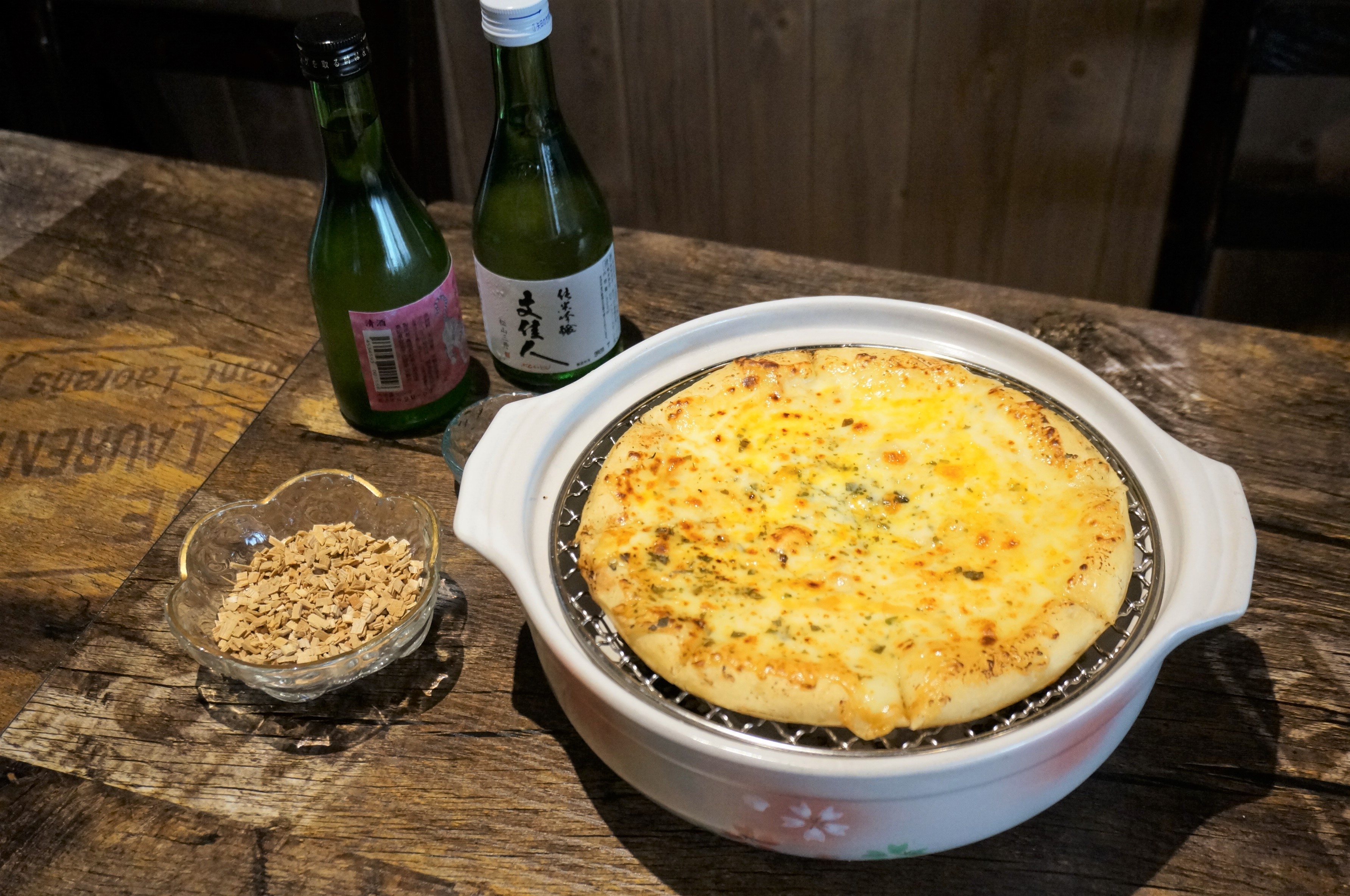 「煙燻日本豚腩肉」把肉切成厚片後再香煎,再以櫻花木煙燻,香脆卻不會太油膩,豚腩肉與煙燻味非常合拍。另一款「煙燻五重芝士Pizza」採用日本製藍芝士、荷蘭高達芝士、德國草原芝士等五款芝士製成,廚師會先將Pizza底煎至香脆,再燻製約5分鐘。芝士部分層次豐富,鹹香味十足。客人亦可個別自選海鮮下單,酒場師傅會以相對清淡的菊花煙燻約5至7分鐘,以保留海產的鮮味,如「煙燻穴子壽司」,以鰻魚汁掃上穴子表面後再煙燻,然後將燻好的穴子包裹著壽司飯,再醮上蟹子,口感層次豐富。