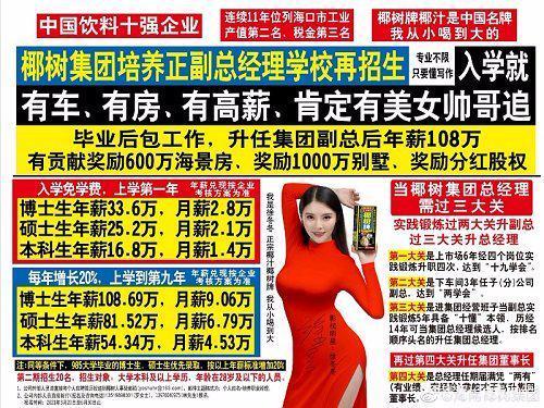 據內地媒體此前報道,3月25日,ST椰島在其官方微博發布了一則招生廣告,畫風依舊是濃濃的「椰樹風」:配色是公司常用的大黃大紅,加黑加粗藝術字鋪設得滿滿當當,最突出的是一個身體扭成S形的美女拿著椰汁,並且配圖也是直截了當:椰樹集團培養正副總經理學校再招生,專業不限只要懂寫作,入學就有車、有房、有高薪、肯定有美女帥哥追。