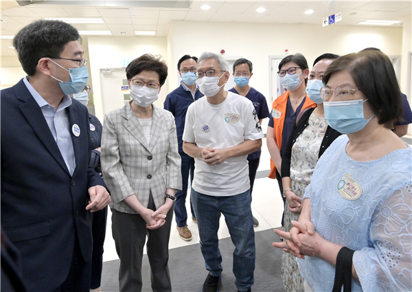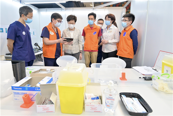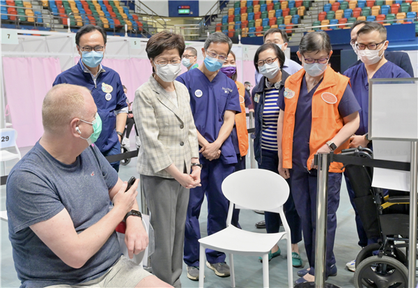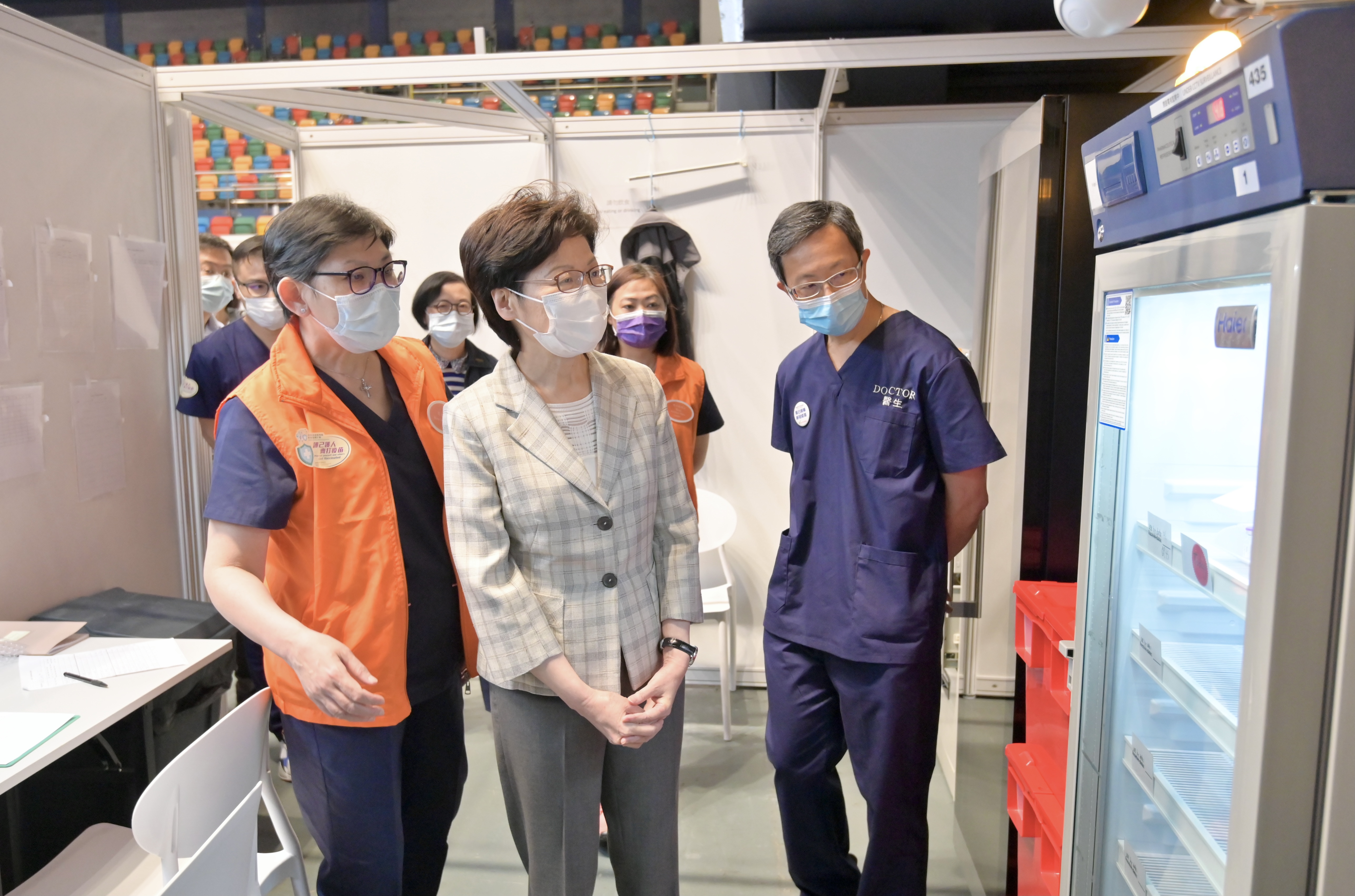 林鄭月娥在負責統籌政府疫苗接種計劃的公務員事務局局長聶德權和食物及衛生局局長陳肇始教授陪同下,到已投入服務為已預約市民接種復星疫苗的伊利沙伯體育館社區疫苗接種中心視察,聽取營運的醫療機構人員介紹運作情況。林鄭月娥亦與前來接種疫苗的市民交談,他們都認為中心運作暢順,對接種安排感滿意。