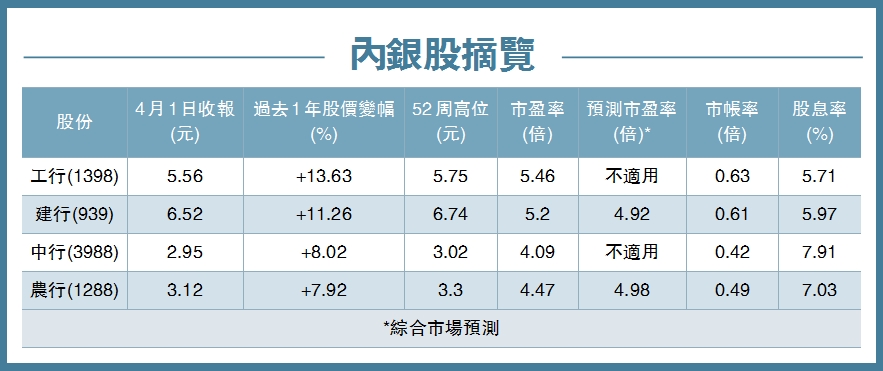 機構投資者及散戶揀選內銀股都離不開尋求穩定股息回報。即使四大內銀近日股價已顯著反彈,但過去一年計股價表現仍大落後。現價股息率介乎5.71%至7.93%,且估值偏低,四大行的市帳率介乎0.42倍至0.63倍,現價算相當吸引,無疑是高息之選。