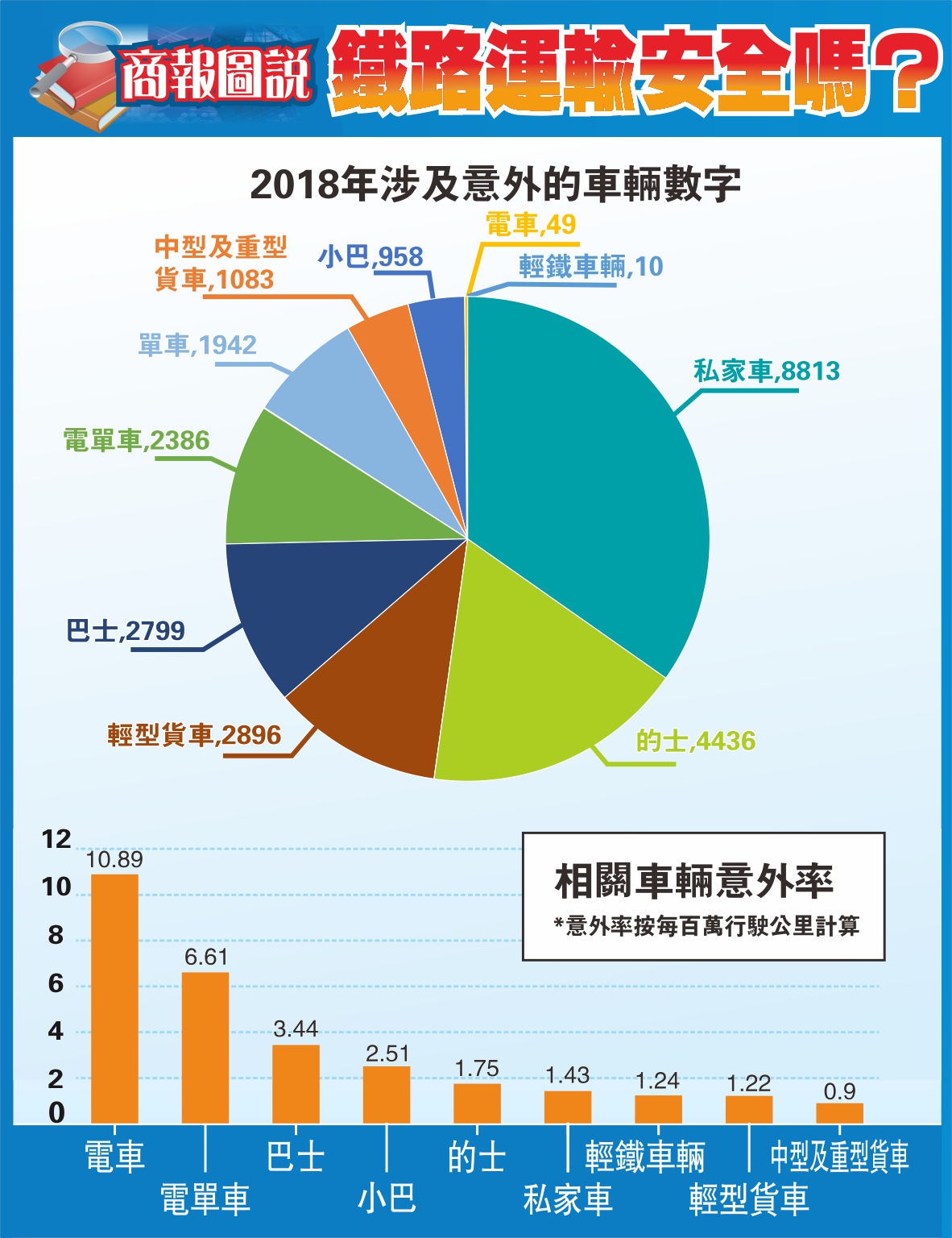 本港統計處資料顯示,2018年車輛意外數字為25726宗,當中佔最多的乃是私家車約8800宗,其次是的士逾4400宗,至於輕型貨車、巴士、電單車則約2000多宗,就連單車意外都有近2000宗;反之,涉及輕鐵車輛的意外,則只有10宗,電車意外則約49宗,顯示軌道交通系統的意外相對偏低。