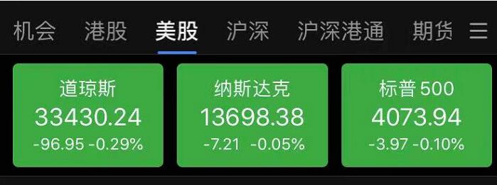截至收盤,道指收跌96.95點,跌幅0.29%,報33430.24點,結束兩日連漲;標普收跌0.1%,報4073.94點;納指收跌0.05%,報13698.38點,跌離周一所創的2月19日以來收盤高位。