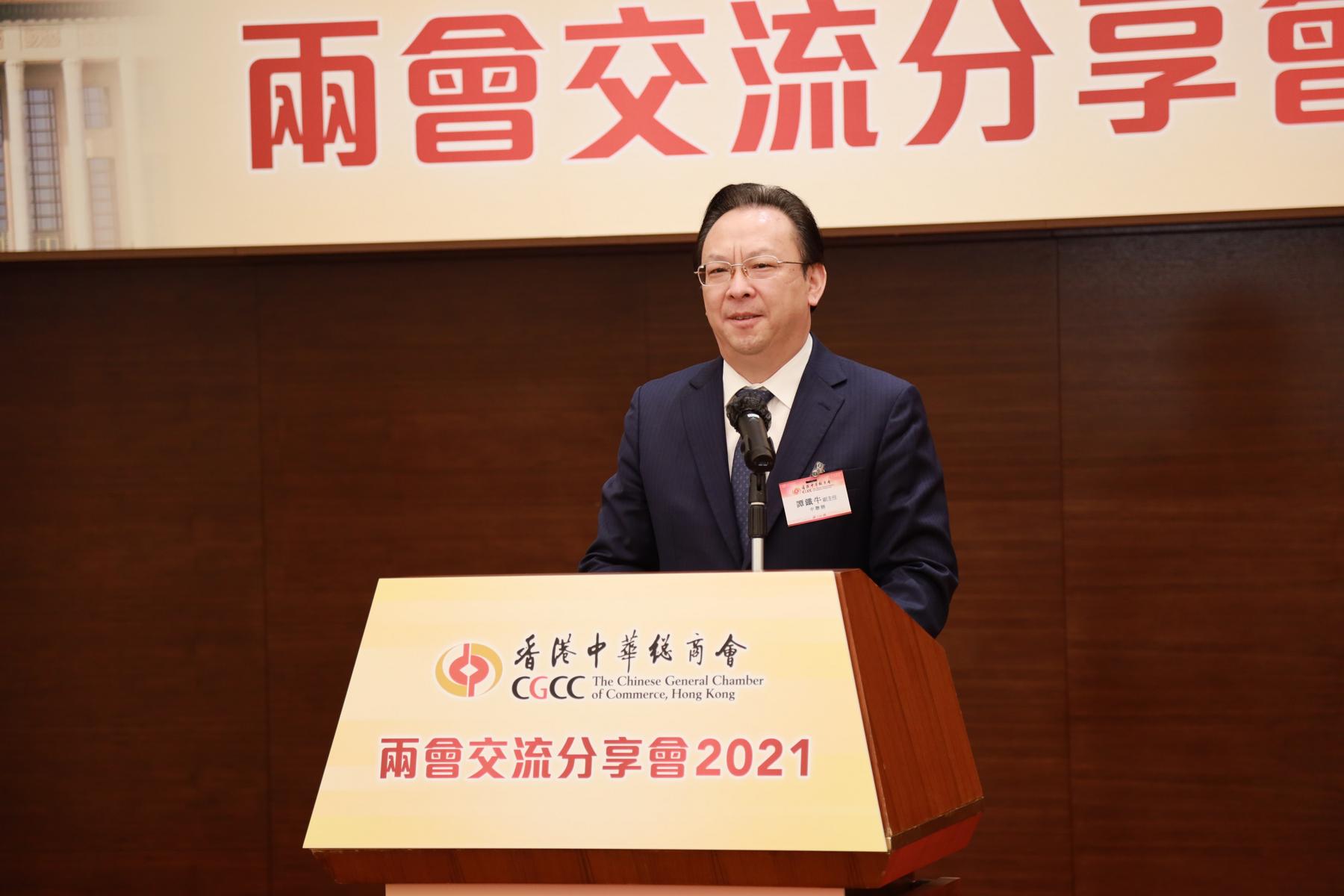 香港中華總商會7日舉辦「2021年全國人大政協交流分享會」。中聯辦副主任譚鐵牛應邀擔任主旨演講嘉賓,分享今年兩會重要精神與政策方向。中總會長袁武代表該會致歡迎辭。全國人大常委譚耀宗,全國政協常委、中總永遠名譽會長蔡冠深擔任專題演講嘉賓,暢談會議對香港帶來的啟示,以及對完善香港選舉制度的意見。