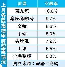中環最新呎租回升至60.9元,首季累錄12.4%進帳。上環首季亦升6.7%,最新呎租約50.5元。然而,尖沙咀及非核心區如東九龍跑輸,尖沙咀甲廈租售價期內均錄下跌,當中呎價跌5.6%至1.16萬元。其中東九甲廈由於空置率近17%,故租金累挫4.8%,最新呎租僅22.3元。