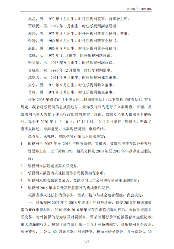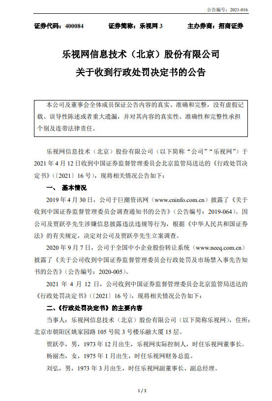 12日晚間,樂視網公告,因公司2007年至2016年連續十年財務造假等,北京證監局對公司合計罰款2.4億元,對賈躍亭罰款2.41億元。