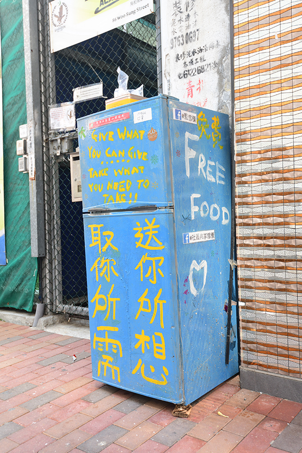 藍雪櫃上中英文對照寫上「免費(FREE FOOD)」、「送你所想,取你所需(GIVE WHAT YOU CAN GIVE……TAKE WHAT YOU NEED TO TAKE)」等顯眼標示,英文字出自簡仲文手筆,中文則由同事幫忙寫上。雪櫃上層放了獨立包裝口罩,下層則有林林總總的食物,如餅乾、罐頭、杯麵。滿滿的一雪櫃食物,大約半小時就被清空。當「空櫃」了,雪櫃旁設有鈴鐘,有需要的人可按鈴請職員前來補貨。這些乾糧也許不能讓人三餐溫飽,但雪中送炭,總能溫暖人心,最重要是將互助互愛的精神在社區內傳遞開去。