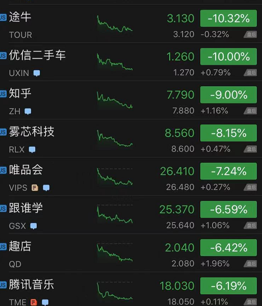 熱門中概股多數隨大盤下跌,百度、京東、嗶哩嗶哩、拼多多均跌超2%,騰訊ADR跌0.2%,跟誰學跌6.6%。騰訊音樂跌約6.2%,愛奇藝跌3.81%,途牛跌10.32%,知乎跌9%,優信二手車跌10%,唯品會跌7.24%。