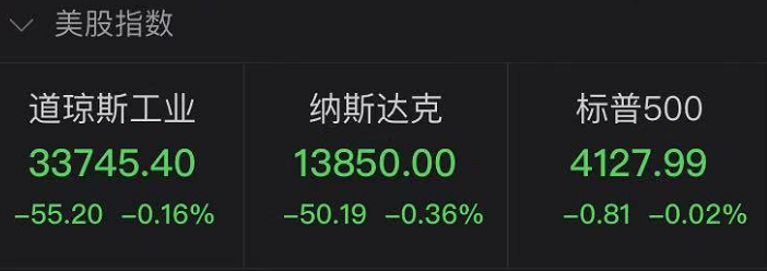 截至收盤,道指跌55.2點,報33745.40點,跌幅為0.16%;納指跌50.19點,報13850.00點,跌幅為0.36%;標普500指數跌0.81點,報4127.99點,跌幅為0.02%。