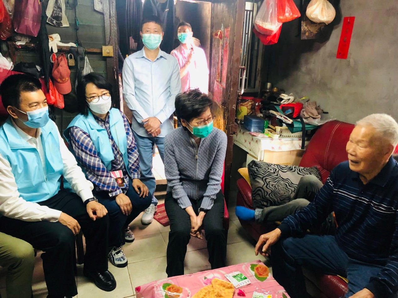 特首林鄭月娥(右二)、香港廣西社團總會創會會長譚錦球(左一)及文頴怡(左二) 探訪流浮山長者,並派發抗疫福袋。