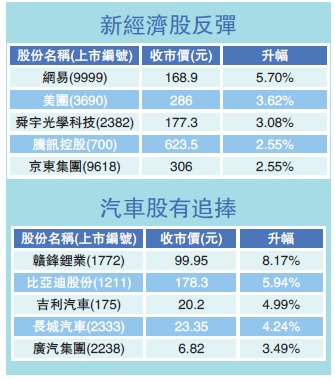 汽車股有追捧,市傳吉利汽車(175)母公司旗下兩家公司計劃上市,吉利升近5%,比亞迪股份(1211)升近6%,市傳廣汽集團(2238)跟騰訊深化戰略合作關係,升逾3.4%。