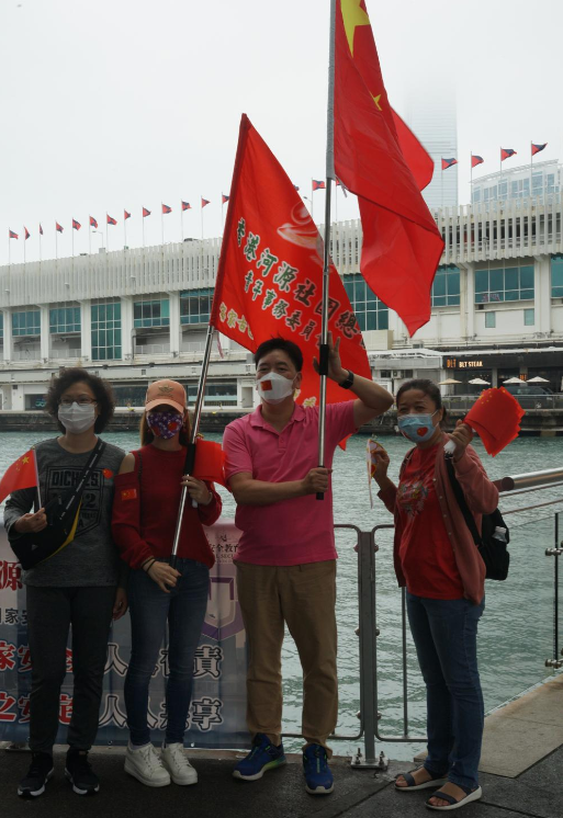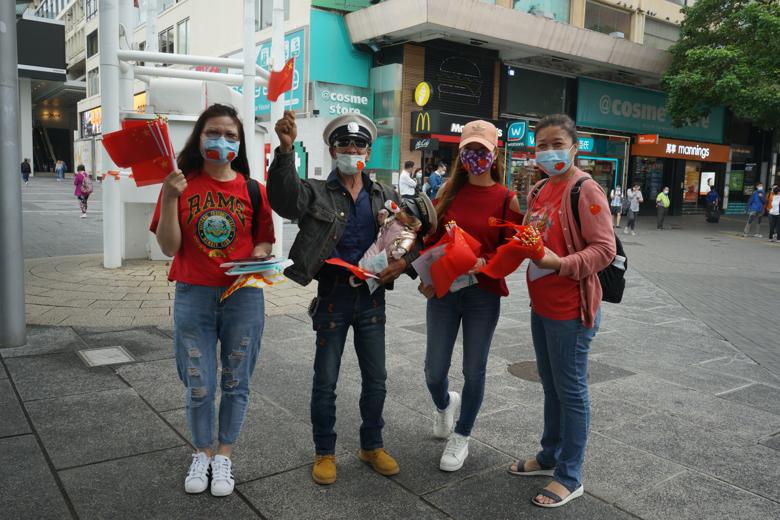 熱心市民接受派發傳單後與義工合影表達愛國之情。
