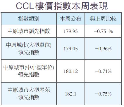 反映二手樓價走勢的中原城市領先指數CCL最新報179.95點,按周跌0.75%。中原城市大型屋苑領先指數CCLMass報182.10點,按周跌0.75%。CCL(中小型單位)報180.12點,按周跌0.71%。CCL(大型單位)報179.05點,按周跌0.96%。CCL、CCL(中小型單位)及CCL(大型單位)連續6周於180點附近企穩,CCLMass連續6周於182點附近企穩。