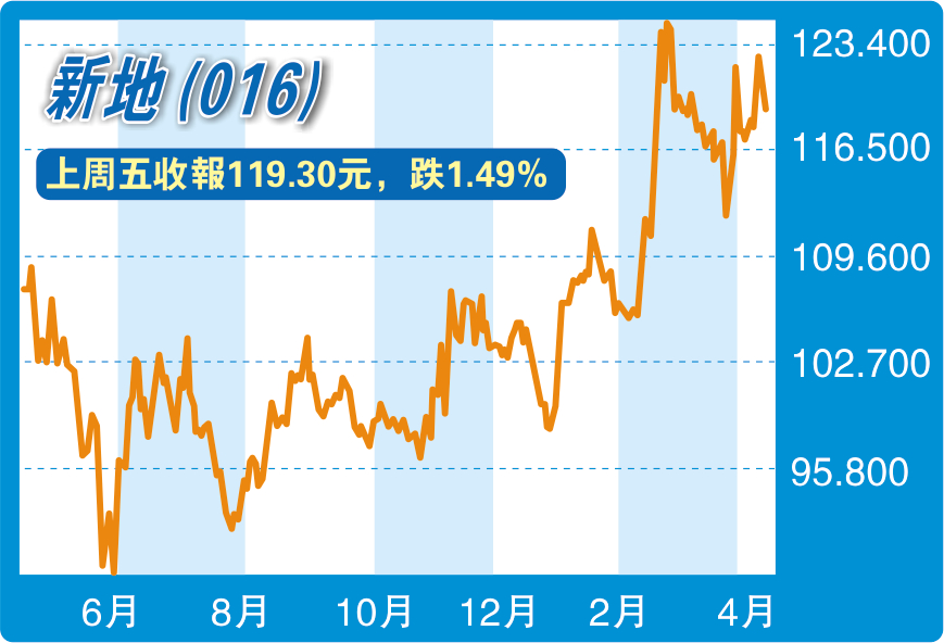 溫傑亦看好新地的投資前景。他指,新地作為本港大型地產公司,收入盈利有保障,建議可待新地股價有所回落,於110元買入,目標價是130元,止蝕價為買入價的10%。同時,他看好新世界發展,因新世界發展旗下K11集團銷售額去年下半年增長45%,其中香港K11去年下半年銷售額增長56%,遠遠超越香港零售銷售的整體表現。他建議,新世界發展的買入價為37至38元,目標價為41.5元,止蝕價為買入價的10%。