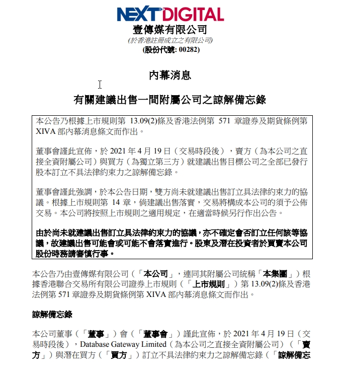 壹傳媒強調,雙方目前尚未針對這項交易,訂立「具法律約束力」的協議。而正式協議的最終條款,必須以訂約方的進一步磋商結果為准,目前尚未落實,因此可能與諒解備忘錄的記載「有所偏離」。