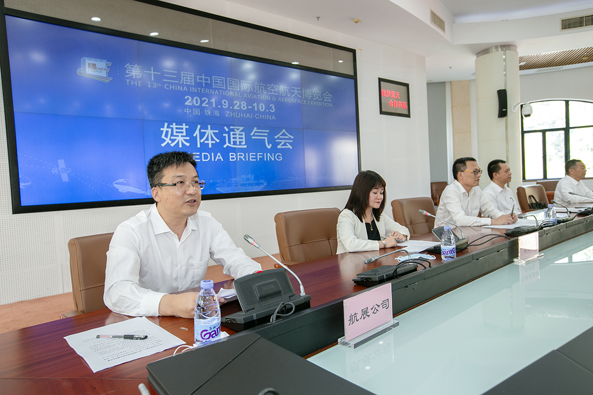 孫潔峰(左一)介紹本屆航展情況。(陸紹龍攝)