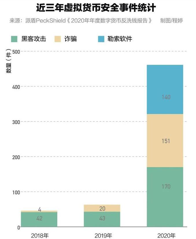 除了「殺豬盤」,黑客攻擊、勒索攻擊也占較大份額。2020年,虛擬貨幣行業的黑客攻擊事件有170起,較2019年增長300%。