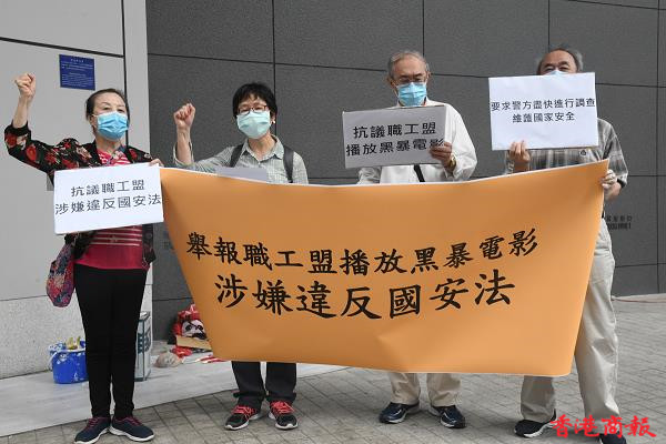 有請願人士今早到警總請願,舉報職工盟本月初在其社交媒體中公告:會於放映《理大圍城》,《佔領立法會》和《中大保衛戰》等「黑暴」紀錄片,並不時舉辦非公開放映等活動,據悉他們的首場已於4目11日放映,而上周六及本周六更放映隨後的兩場。