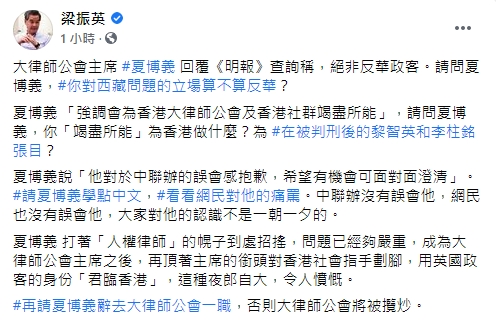 昨晚(25日)11时左右,全國政協副主席梁振英于FB发文,驳斥此前夏博義回覆《明報》查詢时所言,對於夏博義用英國政客的身份「君臨香港」此等夜郎自大的说辞和行径感到憤慨,希望其辭去大律師公會一職,使大律師公會免遭攬炒。