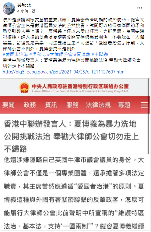 昨晚(25日)8時許,工聯會會長吳秋北於FB引述中聯辦發言人針對夏博義的談話,表示夏博義擔當大律師公會主席是對港區國安法的公然挑釁,要求大律師公會及夏博義公開交待與黑暴關係,強調司法要獨立更不可違背「愛國者治港」原則。