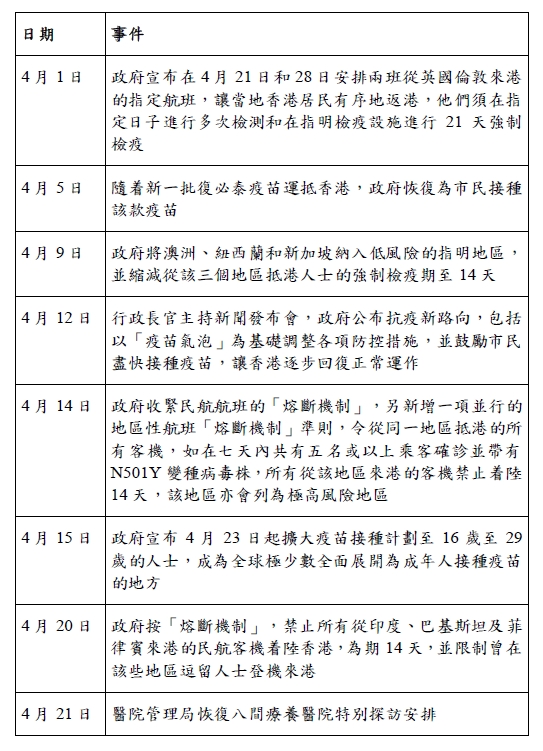 在外防輸入方面,我們亦毫不鬆懈,在4月中收緊了民航航班的熔斷機制,並因應多宗由印度、巴基斯坦及菲律賓抵港的輸入個案中驗出變種病毒,在4月20日已按機制禁止所有從該些地區來港的民航客機着陸香港,為期14天。