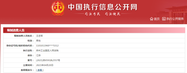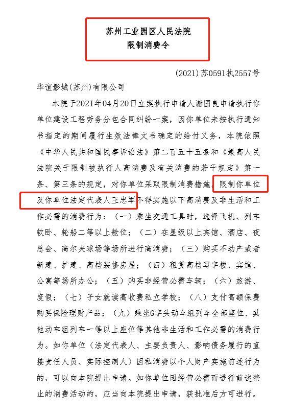 據中國執行信息公開網顯示,4月20日,華誼影城(蘇州)有限公司新增一條限制消費令信息,案號(2021)蘇0591執2557號,限制消費人員為華誼影城(蘇州)有限公司及其法定代表人王忠軍。