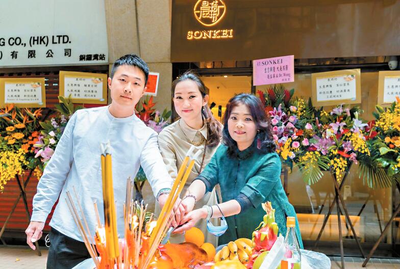 黃小虹與兒子廖浚朝及媳婦齊切燒豬,慶祝美容院開張大吉。