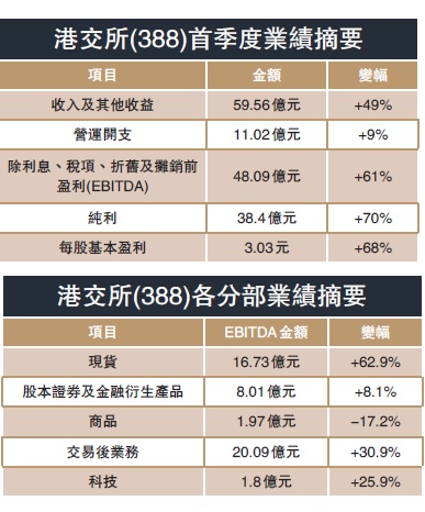 港交所(388)28日公布,截至今年3月底止,首季度純利按年增長70%至38.4億元,符合市場預期。來自「滬港通」和「深港通」的收入為7.37億元,按年急增82.4%,創單一季度新高。