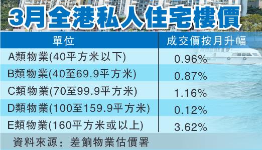 據中原統計,各類單位中,3月升幅最顯著的是面積1722方呎以上E類單位,按月大升3.62%至334.9點,更比去年10月低位300.3點大升11.5%。其餘單位中,面積430方呎以下A類物業按月升0.96%;431至752方呎B類物業按月升0.87%;753至1076方呎的C類物業按月升1.16%;1076至1721方呎的D類物業按月升0.12%。