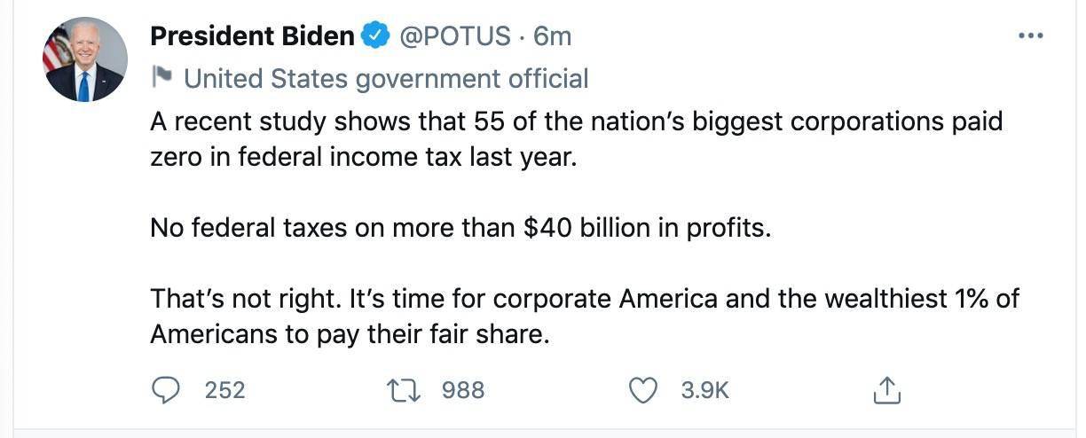 拜登在執政屆滿100天之際向美國國會參眾兩院聯席會議發表演說。他稱,是時候讓最富裕人群中的1%支付公平的(稅收)份額了。「我不會對年收入不到40萬美元的美國人徵稅 ,但美國富人和企業需要支付他們應該支付的稅。」拜登說,徵稅是為了支持基礎建設方案,為美國財政提供支持。