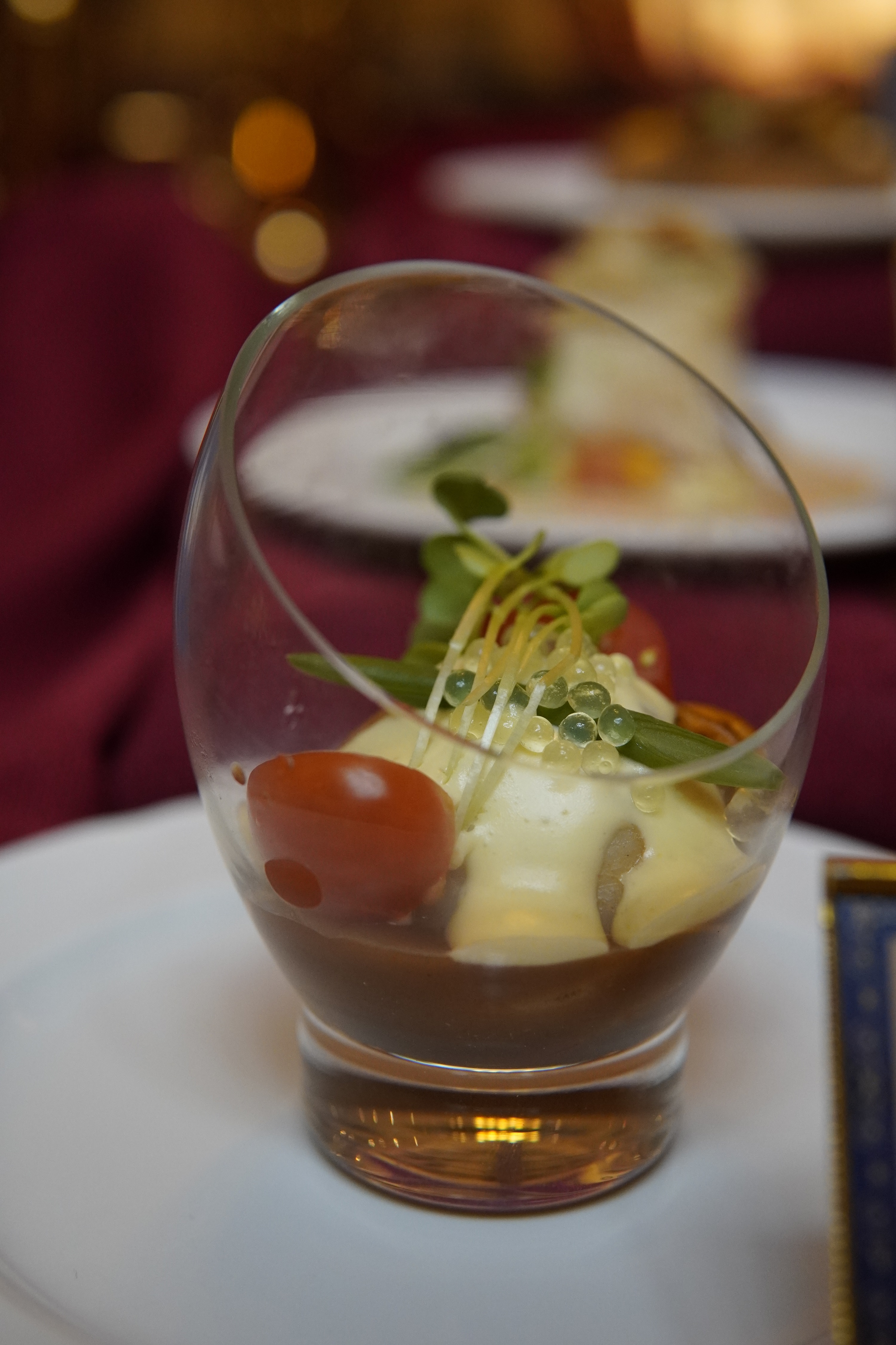 一、「海鮮柚子沙巴翁」為2015年HOFEX銀獎得獎菜式,一聽沙巴翁以為是意大利甜品?實情是將甜品變為鹹食的一道變奏曲,沒有蛋香味,反而傳來濃郁的海鮮味,廚師以龍蝦蝦殼用2小時慢煮成濃郁底汁,配以分子料理方法製作而成的魚子形柚子醬,甜甜酸酸,很開胃。