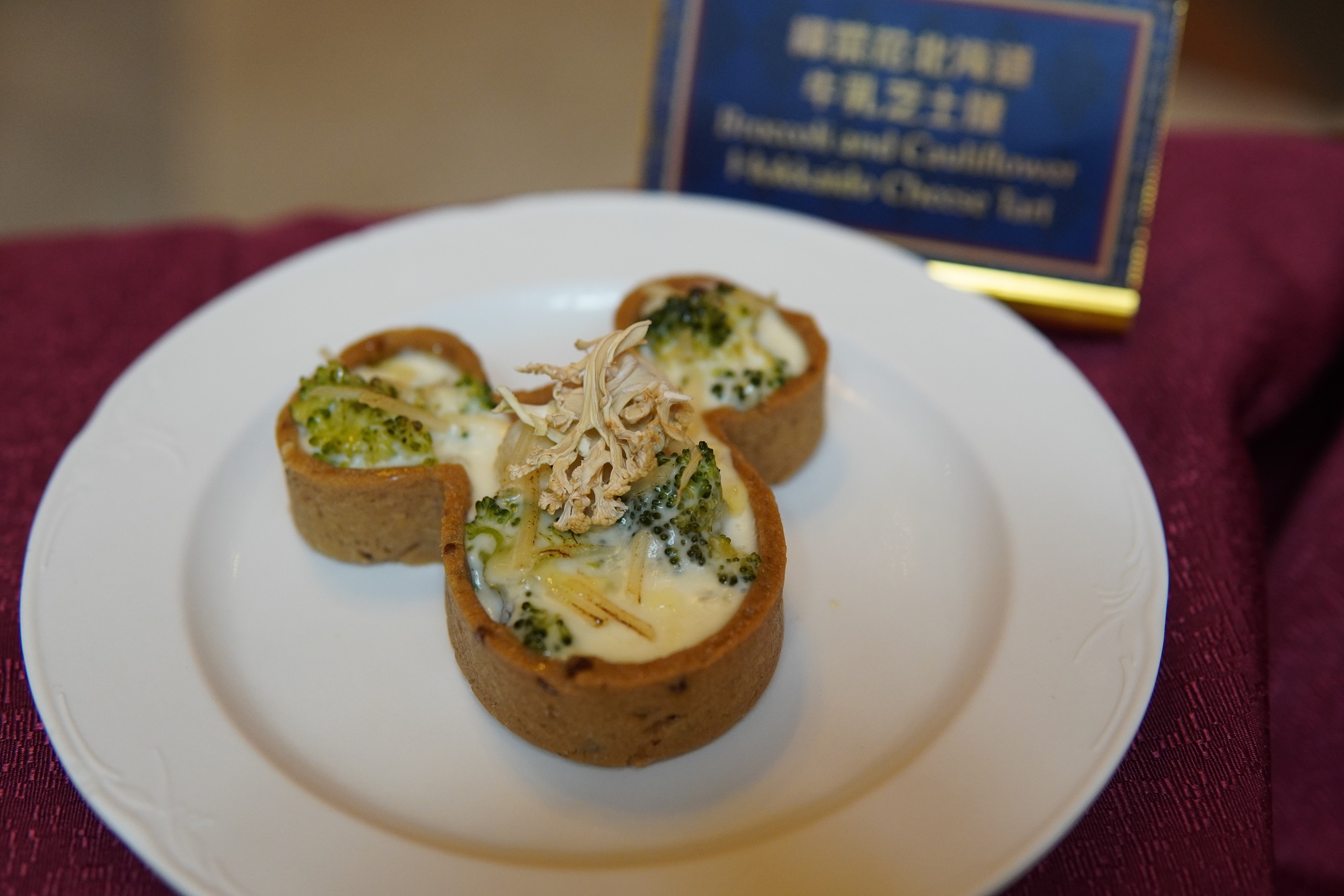 二、「椰菜花北海道牛乳芝士撻」以可愛米奇造型吸引了記者,以燕麥作撻底,只是略嫌撻底不夠鬆脆,但勝在口感豐富,底層是以日本牛乳及芝士焗製的椰菜花,表面有椰菜花乾脆片,加上無人不愛的芝士,單是打卡已夠搶鏡。