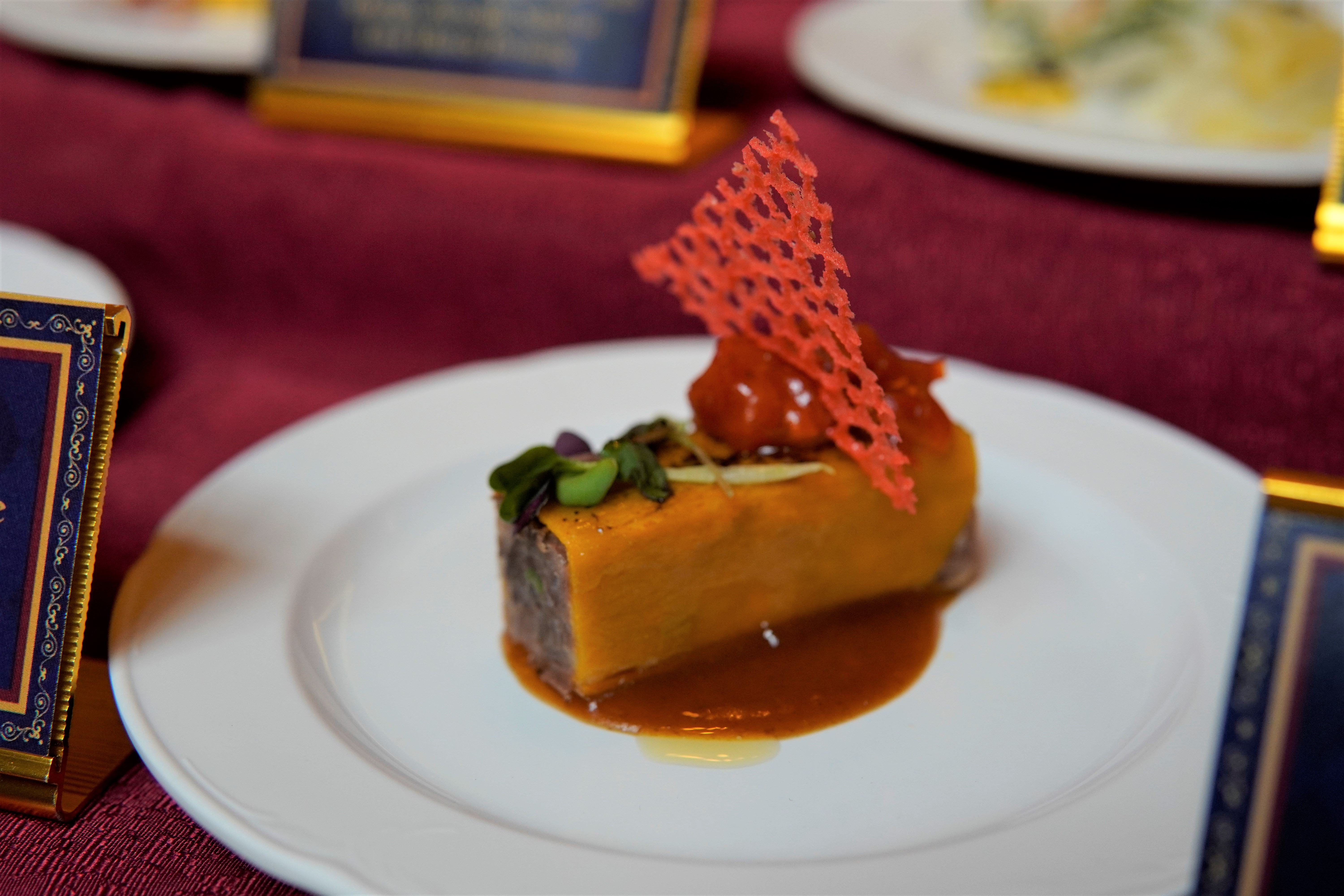 三、在多款得獎菜式中,最得記者歡心的是「燴牛肋肉配南瓜」,給人耳目一新的感覺。這菜式並不是直接把牛肋肉切成的,而是先把牛肋肉燜煮2小時,再拆絲,並加入番茄醬烹煮,之後才製作成一個小方塊,再於表面鋪上一層由橄欖油加麵粉製成的網狀脆片,非常美味,雖然只是一小塊,但其功夫也配得上$40一碟。