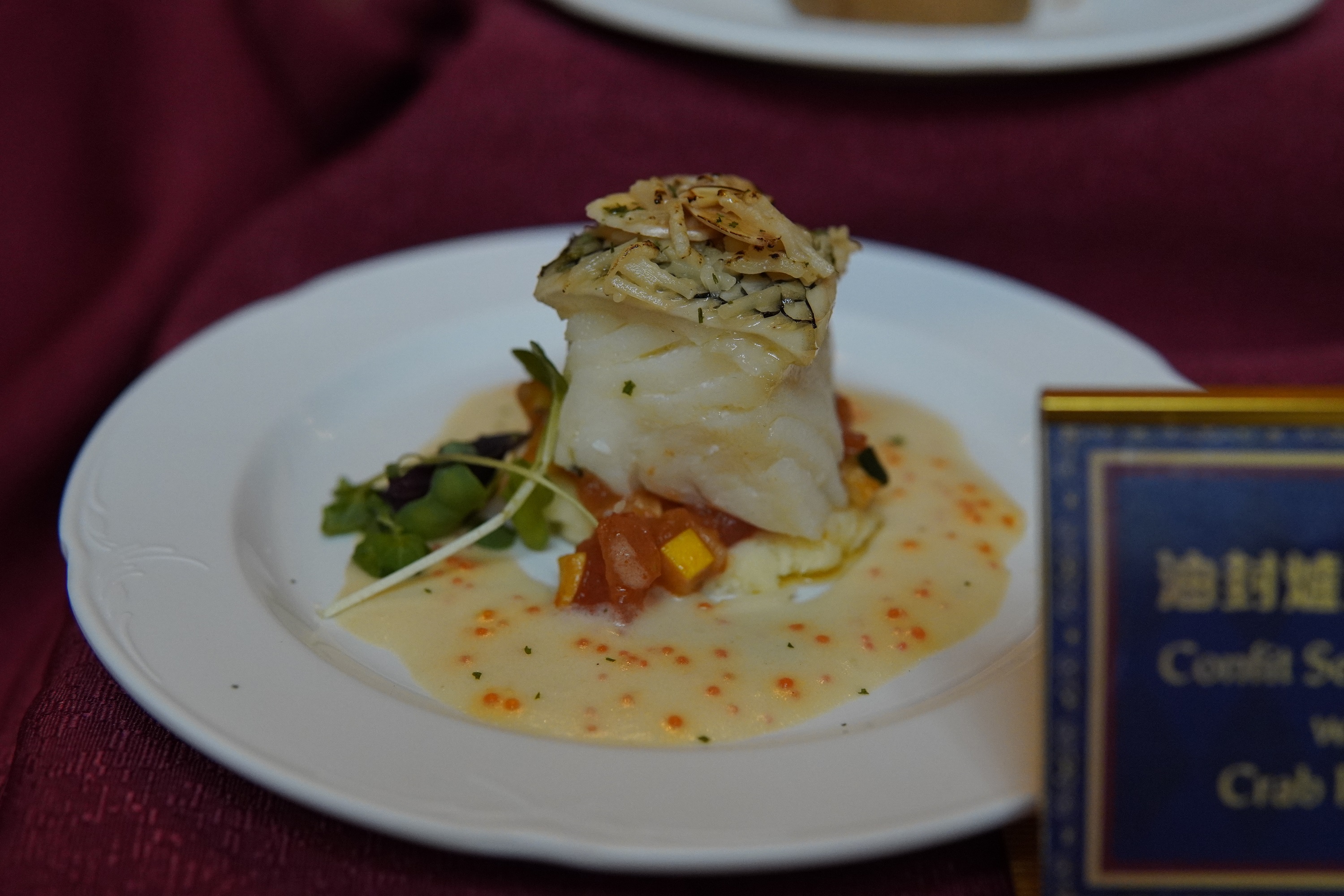 四、「油封鱸魚配蟹籽忌廉汁」,鱸魚以低溫浸煮,保留住鱸魚的油分,令它不容易散開,分外嫩滑,再配以杏仁片及麵包糠在上面,增添層次。