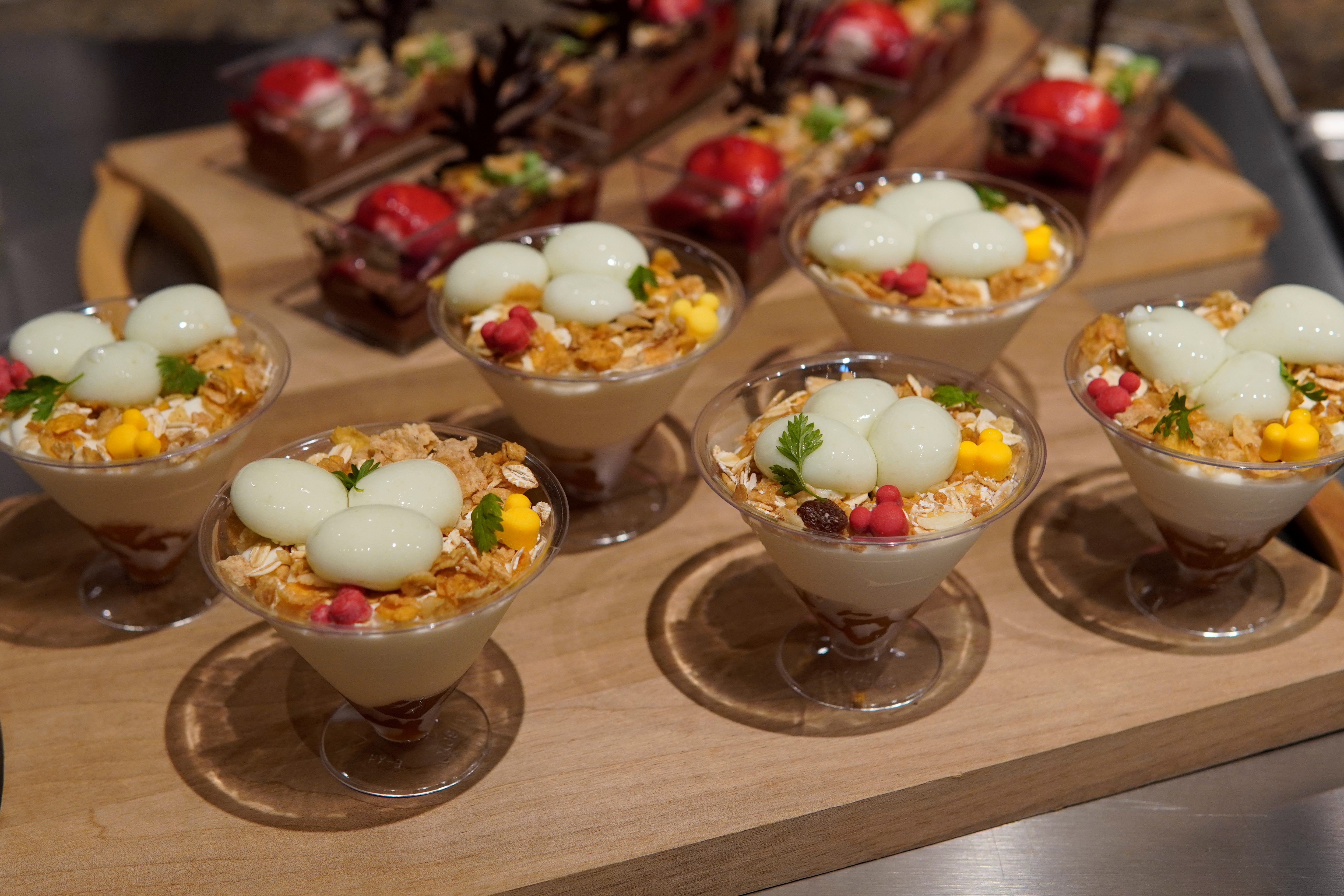 六、今次美食節中,樂園特別推介分子甜品料理廚房,每星期提供6款創意甜品。主廚Stephen引述謝霆鋒所說:「分子料理的特點就是所吃非所見,吃第一次未必想吃第二次,所以今次分子料理就主打甜品,大概無人會拒絕甜品。」食客可以在現場觀看廚師製作,一探其「真身」。圖中這款「椰子布甸配古巴高球雞尾酒」,鋪在上面的白色分子波波,一入口就爆發出酒味,原來是用氣槍將把以朗姆酒、青檸汁、糖和薄荷調成的莫吉托(mojito)打進波波,再鋪於用朗姆酒、鳳梨汁和椰子製成的雞尾酒椰子菠蘿冧酒(Pina Colada)的分子魚子上。