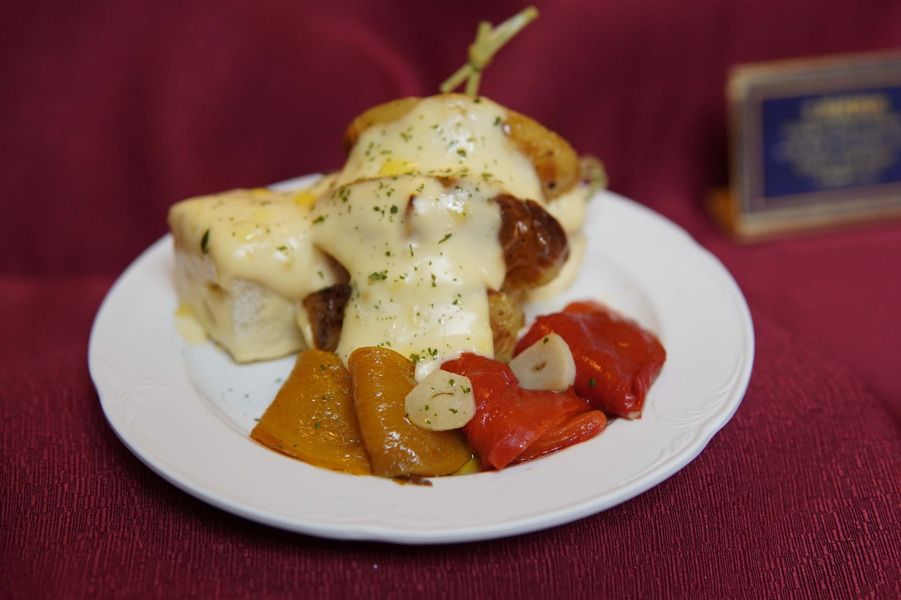 九、「芝士控」記得試試「芝士噴泉」,車打芝士配上麵包、薯仔,為普通食材畫龍點睛。可能廚師覺得太「邪惡」了,旁邊放置四塊紅椒、黃椒,幫大家平衡味道,但記者覺得這配角更勝主角,意想不到軟身薄片的甜椒可以炮製得那麼好吃!