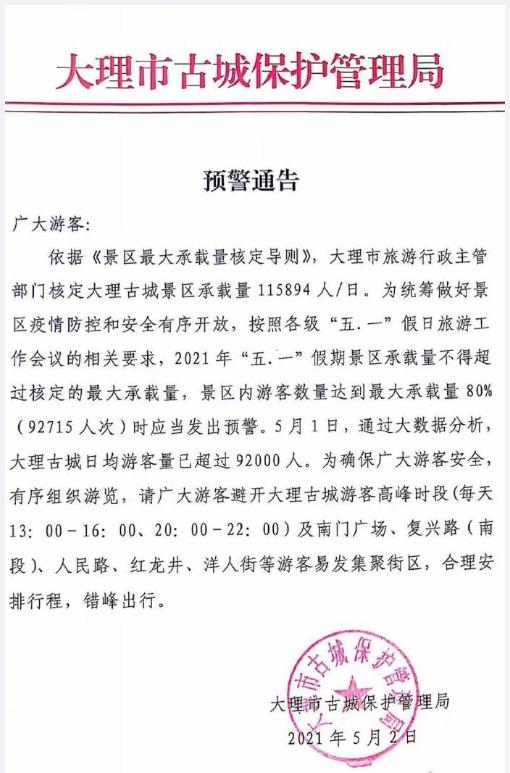 根據景區疫情防控和安全要求,雲南大理古城保護管理局於今日(2日)發布預警通告:為確保廣大遊客安全有序組織遊覽,請廣大遊客避開大理古城遊客高峰時段(每天13:00—16:00, 20:00—22:00)及南門廣場、復興路(南段)、人民路、紅龍井、洋人街等遊客易發集聚街區,合理安排行程,錯峰出行。