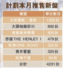 市場憧憬經濟復蘇及恢復通關,預料本月一手成交量將回升到2000宗至2500宗,逾4000伙新盤單位有待推售(見附表)。美聯物業住宅部行政總裁布少明預料,5月份將有多個樓盤部署開售,市場氣氛暢旺,預料本月成交量將按月倍升至逾2000伙至2500伙。