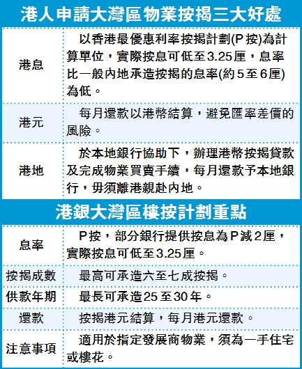 據本報記者觀察,現時本港多間銀行均有提供大灣區按揭,包括中銀香港(2388)、建設銀行(939)、工銀亞洲、中信銀行(國際)、東亞銀行(023)等等。在香港承造大灣區物業按揭主要有三大優勢,包括低於內地的按揭息率、港元還款避免匯率波動,以及一站式在港辦理按揭及完成物業買賣手續。即使疫情導致無法如常通關,也不會打亂置業步伐。