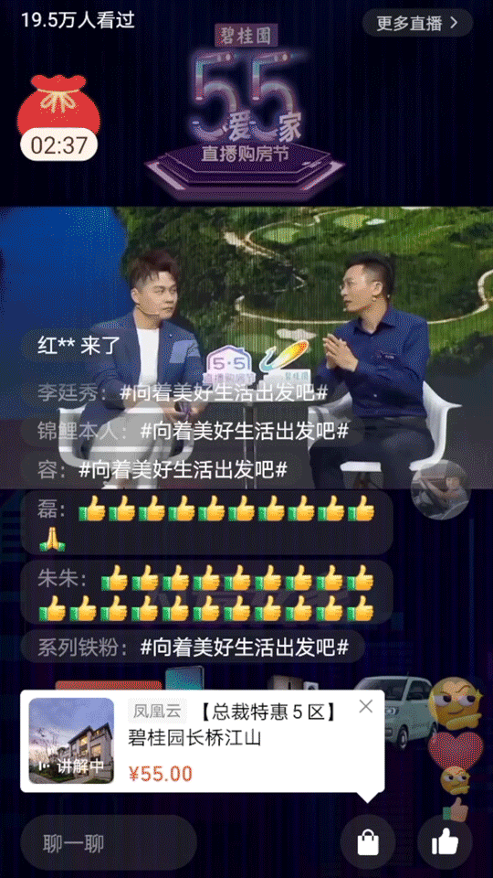 不同特質的兩位女星,在與金牌主持沈濤的交鋒中,碰撞出「愛家」的火花。正如傅首爾在直播中所言,「與愛的人在一起,柴米油鹽也是詩」,正契合了碧桂園「家圓團圓」的品牌主張,展示出人世間「愛」的美好。此外,地產大V劉德科同樣坐鎮直播現場,結合市場形勢,為網友專業分析投資機會,與網友答疑解惑。