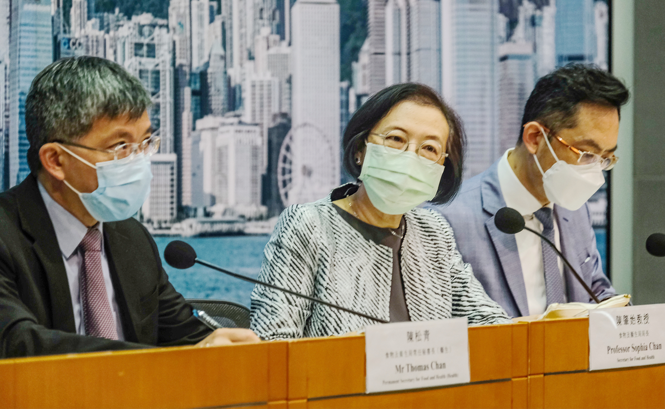 食物及衛生局局長陳肇始、食物及衛生局常任秘書長(衛生)陳松青、衛生署衛生防護中心總監林文健7日就最新檢疫安排舉行記者會。陳肇始表示,當局大致追蹤到變種病毒傳播鏈,暫時無發現變種病毒在社區大規模爆發,故她認為未來可以更精準調校檢疫政策,不需要全幢居民送檢。根據專家及衛生防護中心轄下科學委員會建議,完成接種疫苗並已相隔14日的人士,若被列為患者的緊密接觸者,可獲安排較短的檢疫期。