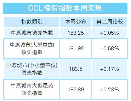 CCL(大型單位)報181.92點,按周跌0.58%,上周指數創85周新高後單周回軟。豪宅樓價距離歷史高位相差5.21%。