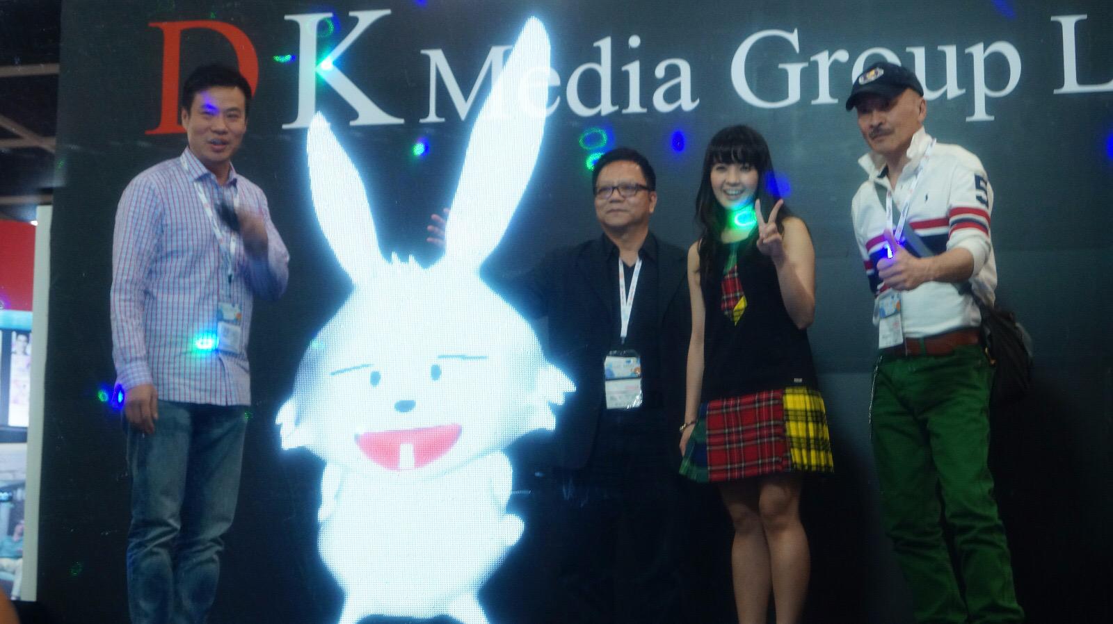 汪展豪(左一)在2015屆香港國際影視展與嘉賓糖妹(左三),李子奇(左四)展示全息互動投影。