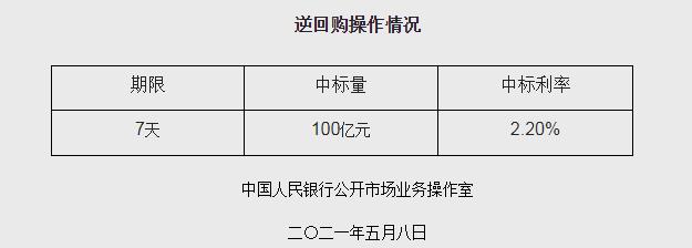 據人行網站消息,為維護銀行體系流動性合理充裕,2021年5月8日人民銀行以利率招標方式開展了100億元逆回購操作。具體情況如下: