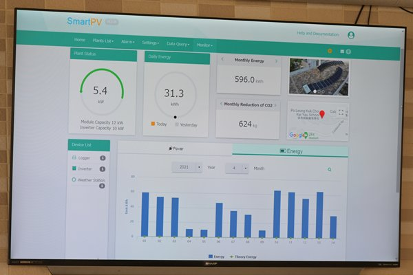 實時監察系統顯示太陽能發電系統運作情況,包括產電量、減少釋放的二氧化碳量等資料。