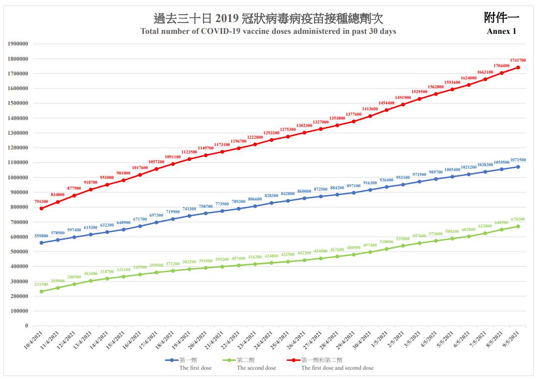9日晚間港府公布,接種計劃開展以來,已為市民接種共約1741700劑疫苗。當中約1071500名市民已接種第一劑疫苗,包括約477000名接種科興疫苗,約594500名接種復必泰疫苗。約670200名市民已接種第二劑疫苗,包括約341500名接種科興疫苗,約328700名接種復必泰疫苗。