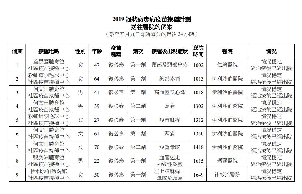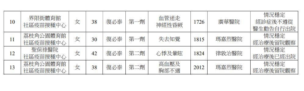 另外,作為背景資料,截至9日零時零分,過去24小時共有33宗中風或心肌梗塞個案,需入住公立醫院深切治療部、急性中風加護病房和心臟加護病房。有關數字為當日新入院的實際數字,可為公眾提供一個參考對照,讓市民更全面理解在接種疫苗後錄得的相類個案。