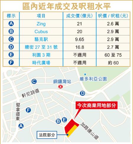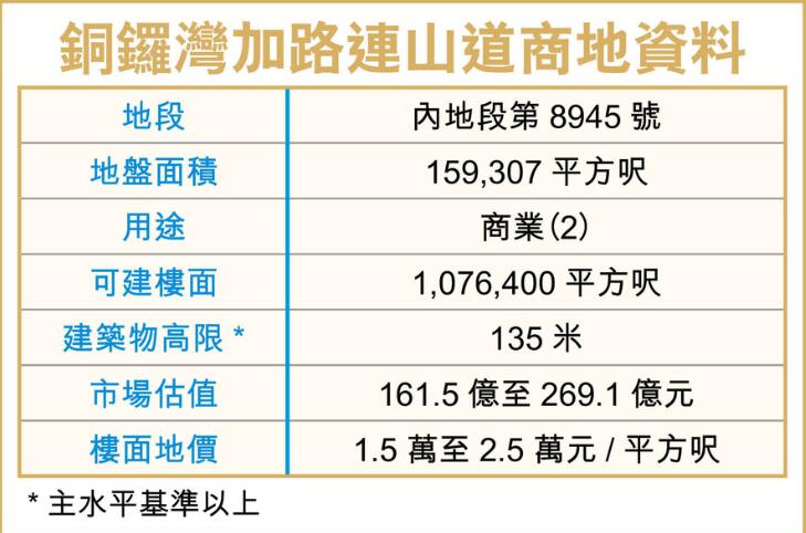 地政總署昨日公布,銅鑼灣加路連山道商業地以197.78億元批出,中標財團為希慎興業(014)及華懋集團。以總樓面約107.6萬平方呎計算,每方呎樓面地價約18374元,較早前估值高出約15%。有分析認為,中標價高於市場估值上限,反映發展商出價進取,對後市信心十足,仍看好銅鑼灣核心區域發展潛力。此外,今次中標發展商在同區有多個項目,可產生巨大協同效應。