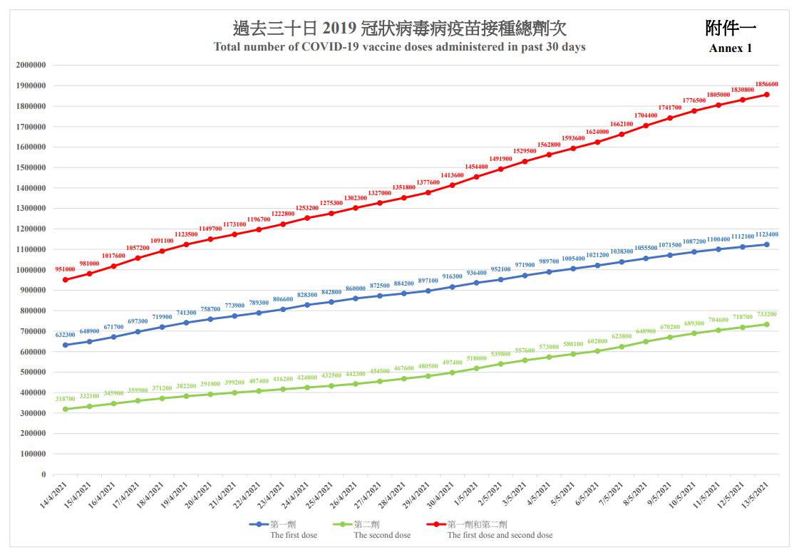政府指,已為市民接種共約1856600劑新冠病毒疫苗。當中約1123400名市民已接種第一劑疫苗,包括約493500名接種科興疫苗,約629900名接種復必泰疫苗。約733200名市民已接種第二劑疫苗,包括約355200名接種科興疫苗,約378000名接種復必泰疫苗。