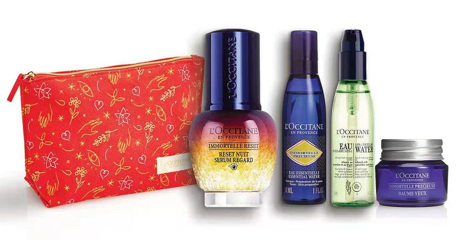 內有精美化妝袋、蠟菊煥活雙效眼部精華15ml、蠟菊青春活肌花香保濕水30ml、青瓜清爽潔膚水30ml、蠟菊青春活肌眼霜4ml